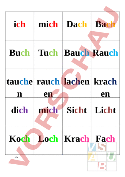 ich mich Dach Bach Buch Tuch Bauch Rauch tauche rauch lachen krach en en dich mich Sicht Licht Koch Loch Krach Fach ich