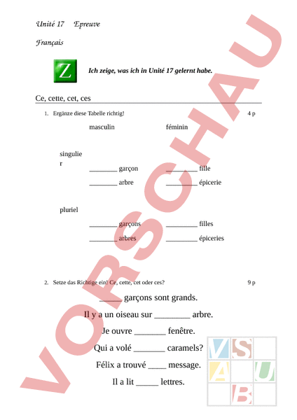Unité 17 Epreuve Français Ich zeige, was ich in Unité 17 gelernt habe. Ce, cette, cet, ces 1. Ergänze diese Tabelle richtig! singulie 4p masculin féminin garçon fille arbre épicerie garçons filles arbres épiceries pluriel 2. Setze das Richtige ein! Ce, cette, cet oder ces? garçons sont grands. Il a un oiseau sur arbre. Je ouvre fenêtre. Qui volé caramels? Félix trouvé message. Il lit lettres. 9p Name: Punkte:/23 Note: Tu as voit belle panthère? vélo va trés vite. filles sont petites. Le passé composé 3. Setze die richtige Personalform des Hilfsverbs avoir in die Lücke ein! 6p a) Tu trouvé un vélo au bord du lac. b) Hier, elle joué avec Pascal. c) Ma maman téléphoné une heure avec ma tante. d) Cest dommage, ils perdu le porte-monnaie. e) Nous mangé une pomme et deux bananes. f) Vendredi passé, j_ regardé un film au cinéma. g) Il fait un gâteau au chocolat. 4. Forme das Verb, das zuhinterst auf der Linie in der Grundform 1 steht, in der richtigen Person ins passé composé um. 4/6 a) Hier, j une grande glace. (manger) b) Ils la rivière sur le pont. (traverser) c) Cest super, nous une pièce de cinq francs (trouver) d) Un homme une nouvelle voiture. (voler) e) Zut, tu ton pull violet. (perdre*) Name: Punkte:/23 Note: f) Hier soir, elles de la musique. (écouter) g) Super, il un beau paquet (faire*)