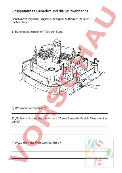 Gruppenarbeit Benedikt und die Brückenbande Beantwortet folgende Fragen zum Kapitel 9. Ihr dürft im Buch nachschlagen. 1) Benennt die einzelnen Teile der Burg. 2) Wo wohnt der Burgherr? 3) „So leicht ging es also doch nicht. Denkt Benedikt für sich. Was meint er damit? 4) Wozu dient der Wehrturm der Burg? 5) Beschreibt die beiden Männer welche Benedikt in der Burg belauscht. Gunter: Montgomery: 6) Was haben die beiden Männer für einen Plan? Erklärt möglichst genau! 7) Was soll mit Graf Ullrich und seiner Tochter Adelgund passieren? 8) Warum will Robert auf einem anderen Weg nach Hause?