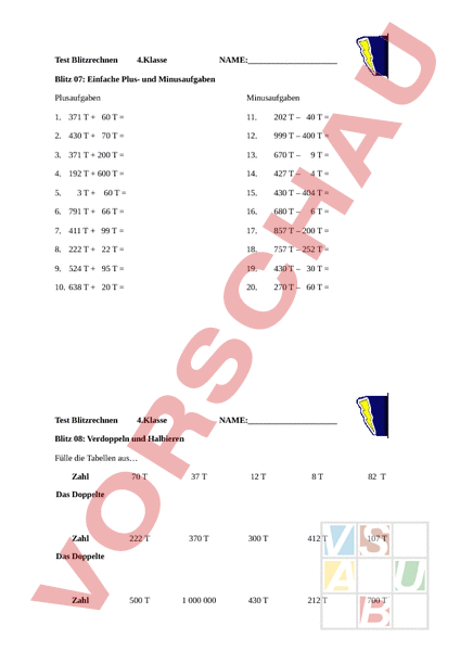 Test Blitzrechnen 4.Klasse NAME:_ Blitz 07: Einfache Plus- und Minusaufgaben Plusaufgaben Minusaufgaben 1. 371 60 11. 202 – 40 2. 430 70 12. 999 – 400 3. 371 200 13. 670 – 9T 4. 192 600 14. 427 – 4T 5. 3 60 15. 430 – 404 6. 791 66 16. 680 – 7. 411 99 17. 857 – 200 8. 222 22 18. 757 – 252 9. 524 95 19. 430 – 30 10. 638 20 20. 270 – 60 Test Blitzrechnen 4.Klasse 6T NAME:_ Blitz 08: Verdoppeln und Halbieren Fülle die Tabellen aus Zahl 70 37 12 8T 82 222 370 300 412 107 500 1 000 000 430 212 700 Das Doppelte Zahl Das Doppelte Zahl Die Hälfte Zahl Die Hälfte 742 510 484 330 540