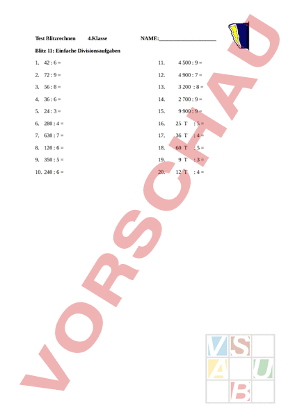 Test Blitzrechnen 4.Klasse NAME:_ Blitz 11: Einfache Divisionsaufgaben 1. 42 6 11. 4 500 9 2. 72 9 12. 4 900 7 3. 56 8 13. 3 200 8 4. 36 6 14. 2 700 9 5. 24 3 15. 9 900 9 6. 280 4 16. 25 :5 7. 630 7 17. 36 :4 8. 120 6 18. 60 :5 9. 350 5 19. 9 :3 10. 240 6 20. 12 :4