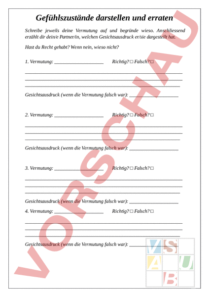 Gefühlszustände darstellen und erraten Schreibe jeweils deine Vermutung auf und begründe wieso. Anschliessend erzählt dir dein/e Partner/in, welchen Gesichtsausdruck er/sie dargestellt hat. Hast du Recht gehabt? Wenn nein, wieso nicht? 1. Vermutung: Richtig? Falsch? Gesichtsausdruck (wenn die Vermutung falsch war): 2. Vermutung: Richtig? Falsch? Gesichtsausdruck (wenn die Vermutung falsch war): 3. Vermutung: Richtig? Falsch? Gesichtsausdruck (wenn die Vermutung falsch war): 4. Vermutung: Richtig? Falsch? Gesichtsausdruck (wenn die Vermutung falsch war):