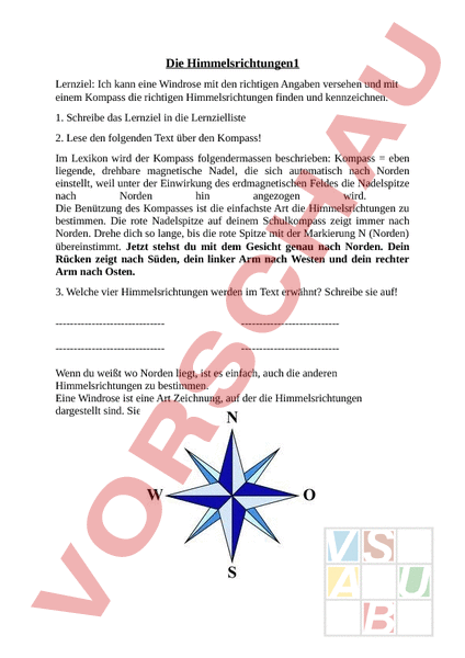 Die Himmelsrichtungen1 Lernziel: Ich kann eine Windrose mit den richtigen Angaben versehen und mit einem Kompass die richtigen Himmelsrichtungen finden und kennzeichnen. 1. Schreibe das Lernziel in die Lernzielliste 2. Lese den folgenden Text über den Kompass! Im Lexikon wird der Kompass folgendermassen beschrieben: Kompass eben liegende, drehbare magnetische Nadel, die sich automatisch nach Norden einstellt, weil unter der Einwirkung des erdmagnetischen Feldes die Nadelspitze nach Norden hin angezogen wird. Die Benützung des Kompasses ist die einfachste Art die Himmelsrichtungen zu bestimmen. Die rote Nadelspitze auf deinem Schulkompass zeigt immer nach Norden. Drehe dich so lange, bis die rote Spitze mit der Markierung (Norden) übereinstimmt. Jetzt stehst du mit dem Gesicht genau nach Norden. Dein Rücken zeigt nach Süden, dein linker Arm nach Westen und dein rechter Arm nach Osten. 3. Welche vier Himmelsrichtungen werden im Text erwähnt? Schreibe sie auf! ------------------------------ --------------------------- ------------------------------ --------------------------- Wenn du weißt wo Norden liegt, ist es einfach, auch die anderen Himmelsrichtungen zu bestimmen. Eine Windrose ist eine Art Zeichnung, auf der die Himmelsrichtungen dargestellt sind. Sie sieht beispielsweise so aus: 4. Löse mit einem Partner oder mit einer Partnerin folgende Aufgaben. Nehmt dafür einen Kompass zu Hilfe! Welche Schulzimmerwand liegt im Norden?: Welche Schulzimmerwand liegt im Süden?: Wie viele Schritte kannst du an der östlichen Wand unseres Zimmers zählen?: Was steht an der Westwand unseres Schulzimmers?: Geht nun nach draussen: Schaue vom Schulhaus in die Richtung des Schönthal Migros. In welcher Himmelsrichtung liegt dieses Einkaufszentrum? Geh nun zum Brunnen auf dem Pausenplatz: Was siehst du im Norden, Osten, Westen und Süden? Mit welchem Spruch merkst du dir die Himmelsrichtungen? Schreibe ihn auf!