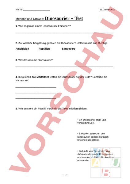 Es handelt sich hier um eine Test, wobei die Schülerinnen und Schüler gefragt werden, wie ein Fossil entsteht und wie einzelne Dinosaurier heissen.
