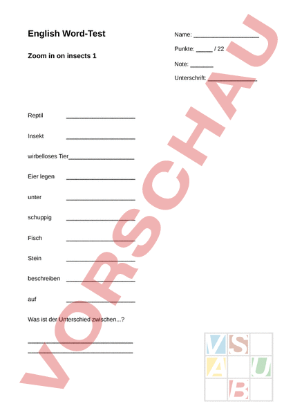 English Word-Test Name: Punkte: 22 Zoom in on insects 1 Note: Unterschrift: Reptil Insekt wirbelloses Tier Eier legen unter schuppig Fisch Stein beschreiben auf Was ist der Unterschied zwischen.? Flügel sich ernähren von Amphibium neben Säugetier wachsen Paar Lebensraum Junge haben über, oberhalb Vogel
