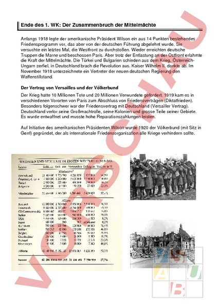 Ende des 1. WK: Der Zusammenbruch der Mittelmächte Anfangs 1918 legte der amerikanische Präsident Wilson ein aus 14 Punkten bestehendes Friedensprogramm vor, das aber von der deutschen Führung abgelehnt wurde. Sie versuchte ein letztes Mal, die Westfront zu durchstoßen. Wieder erreichten deutsche Truppen die Marne und beschossen Paris. Aber trotz der Entlastung an der Ostfront erlahmte die Kraft der Mittelmächte. Die Türkei und Bulgarien schieden aus dem Krieg, Österreich Ungarn zerfiel, in Deutschland brach die Revolution aus. Kaiser Wilhelm II. dankte ab. Im November 1918 unterzeichnete ein Vertreter der neuen deutschen Regierung den Waffenstillstand. Der Vertrag von Versailles und der Völkerbund Der Krieg hatte 10 Millionen Tote und 20 Millionen Verwundete gefordert. 1919 kam es in verschiedenen Vororten von Paris zum Abschluss von Friedensverträgen (Diktatfrieden). Besonders folgenschwer war der Friedensvertrag mit Deutschland (Versailler Vertrag). Deutschland verlor seine Großmachtrolle, seine Kolonien und grosse Teile seiner Gebiete. Es wurde entwaffnet und musste hohe Reparationszahlungen leisten. Auf Initiative des amerikanischen Präsidenten Wilson wurde 1920 der Völkerbund (mit Sitz in Genf) gegründet, der als internationale Friedensorganisation alle Kriege verhindern sollte.
