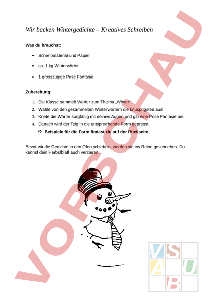 Wir backen Wintergedichte – Kreatives Schreiben Was du brauchst: • Schreibmaterial und Papier • ca. 1 kg Winterwörter • 1 grosszügige Prise Fantasie Zubereitung: 1. Die Klasse sammelt Wörter zum Thema „Winter. 2. Wähle von den gesammelten Winterwörtern die knusprigsten aus! 3. Knete die Wörter sorgfältig mit deinen Augen und gib eine Prise Fantasie bei. 4. Danach wird der Teig in die entsprechende Form gepresst. Beispiele für die Form findest du auf der Rückseite. Bevor wir die Gedichte in den Ofen schieben, werden sie ins Reine geschrieben. Du kannst dein Herbstblatt auch verzieren. Verse schmieden „Verseschmiede nennt man scherzhaft die Reimemacher. Sie treten z.B. an der Fastnacht auf, verfassen kleine Gedichte oder gratulieren zum Geburtstag. Die einfachste Reimform ist a b (Paarreim); andere Formen sind b b (Kreuzreim) oder b a (umarmender Reim). Beachte den Rhythmus und die Zeilenlänge. Sprich zur Kontrolle deine Strophen halblaut vor dich hin. Du solltest ohne zu holpern regelmässig sprechen können. (vgl. Anzahl Silben) Ein Berner namens Edi Bauer fiel von der Bärengrabenmauer, direkt vor einen schweren und als brutal bekannten Bären. Elfchen „Elfchen sind kurze Gedichte aus elf Wörtern, verteilt auf fünf Zeilen. 1. Zeile: ein Wort (wie etwas ist) 2. Zeile: zwei Wörter (ein Gegenstand) 3. Zeile: drei Wörter (Aussage zu Zeile 2: Wo? Wie?) 4. Zeile: vier Wörter (noch mehr erzählen) 5. Zeile: ein Wort: abschliessendes Wort (das Wichtigste) Schwarz Die Nacht Finster und unheimlich Niemand in der Nähe. Angst Mehrere zusammenhängende Elfchens lassen sich zu einem Gedicht mit mehreren Strophen zusammenschliessen. Wortwiederholung Jede Zeile fängt mit dem gleichen Wort an. In der letzten Zeile (oder an einer anderen wichtigen Stelle kannst du dies verändern. Krieg Krieg stoppt Frieden Krieg im Irak Krieg auf dem Pausenhof Krieg lässt sterben Nie wieder Krieg!