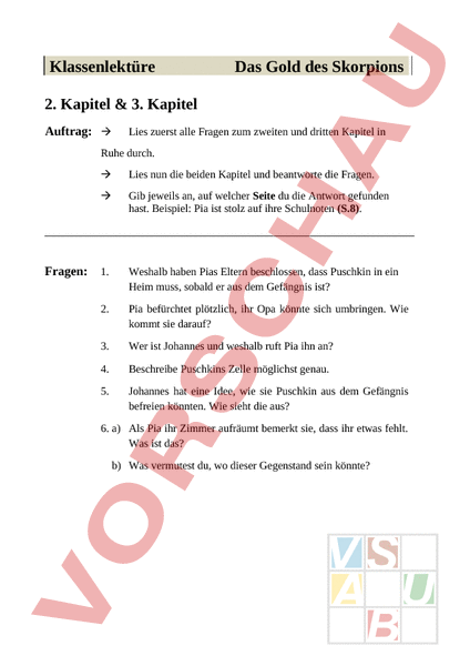 Klassenlektüre Das Gold des Skorpions 2. Kapitel 3. Kapitel Auftrag: Lies zuerst alle Fragen zum zweiten und dritten Kapitel in Ruhe durch. Fragen: Lies nun die beiden Kapitel und beantworte die Fragen. Gib jeweils an, auf welcher Seite du die Antwort gefunden hast. Beispiel: Pia ist stolz auf ihre Schulnoten (S.8). 1. Weshalb haben Pias Eltern beschlossen, dass Puschkin in ein Heim muss, sobald er aus dem Gefängnis ist? 2. Pia befürchtet plötzlich, ihr Opa könnte sich umbringen. Wie kommt sie darauf? 3. Wer ist Johannes und weshalb ruft Pia ihn an? 4. Beschreibe Puschkins Zelle möglichst genau. 5. Johannes hat eine Idee, wie sie Puschkin aus dem Gefängnis befreien könnten. Wie sieht die aus? 6. a) Als Pia ihr Zimmer aufräumt bemerkt sie, dass ihr etwas fehlt. Was ist das? 6. b) Was vermutest du, wo dieser Gegenstand sein könnte?