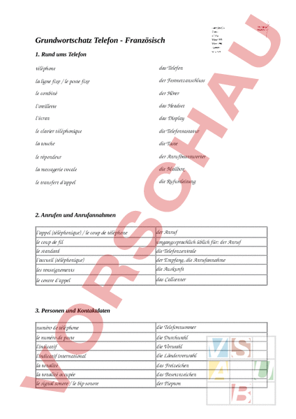 Grundwortschatz Telefon Französisch 1. Rund ums Telefon téléphone das Telefon la ligne fixe le poste fixe der Festnetzanschluss le combiné der Hörer loreillette das Headset lécran das Display le clavier téléphonique die Telefontastatur la touche die Taste le répondeur der Anrufbeantworter la messagerie vocale die Mailbox le transfert dappel die Rufumleitung 2. Anrufen und Anrufannahmen lappel (téléphonique) le coup de téléphone der Anruf le coup de fil le standard laccueil (téléphonique) les renseignements umgangssprachlich üblich für: der Anruf die Telefonzentrale der Empfang, die Anrufannahme die Auskunft le centre dappel das Callcenter 3. Personen und Kontaktdaten numéro de téléphone die Telefonnummer le numéro de poste lindicatif lindicatif international die Durchwahl die Vorwahl die Ländervorwahl la tonalité la tonalité occupée le signal sonore le bip sonore das Freizeichen das Besetztzeichen der Piepton la sonnerie das Klingeln