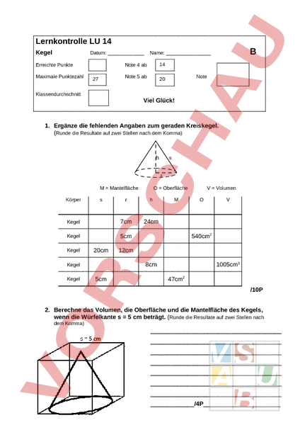 Lernkontrolle LU 14 Kegel Datum: Erreichte Punkte Maximale Punktezahl 27 Name: Note 4 ab 14 Note 5 ab 20 Note Klassendurchschnitt Viel Glück! 1. Ergänze die fehlenden Angaben zum geraden Kreiskegel. (Runde die Resultate auf zwei Stellen nach dem Komma) r Mantelfläche Körper Kegel 7cm 24cm Kegel 5cm Kegel Oberfläche 20cm 5cm 540cm2 12cm 1005cm3 8cm Kegel Kegel Volumen 47cm2 /10P 2. Berechne das Volumen, die Oberfläche und die Mantelfläche des Kegels, wenn die Würfelkante 5 cm beträgt. (Runde die Resultate auf zwei Stellen nach dem Komma) /4P 3. Ein kegelförmiges Zelt soll 15 m Bodenfläche bedecken und eine Höhe von 3 Länge haben. Wie viel Stoff braucht es für den Mantel des Kegels? (Runde die Resultate auf zwei Stellen nach dem Komma) /4P 4. Ein rechtwinkliges Dreieck mit den Katheten 15cm und b 8cm rotiert um die Kathete a. Berechne das Volumen und die Oberfläche des entstandenen Kegels. (Runde die Resultate auf zwei Stellen nach dem Komma) /4P 5. Das gleichschenklige Trapez rotiert um die Symmetrieachse. Welches Volumen und welche Oberfläche hat der entstandene Kegelstumpf, wenn 3m, s2m und M 28.27m2 beträgt? (Runde die Resultate auf zwei Stellen nach dem Komma) M s (rr‘) V 1/3 h (r2 r*r r2) /5P