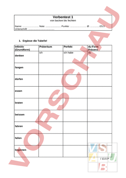 Verbentest 1 von backen bis fechten Name: Note: Punkte: Ø: /25.5 Unterschrift: . 1. Ergänze die Tabelle! Infinitiv (Grundform) Präteritum Perfekt ich ich habe du-Form Präsens du denken fangen dürfen essen braten beissen fahren fallen beginnen 13.5 2. Setze das richtige Verb ein! fallen dringen essen beginnen fahren fangen denken erschrecken beginnen dürfen bleiben a) Die Äpfel vom Baum, wenn sie reif sind. b) Du immer viel zu schnell. Ein Wunder, dass du noch nie in eine Kontrolle gekommen bist! c) Was du eigentlich von mir? d) Er jeden Tag sehr ungesunde Sachen. e) Ich alle Fliegen und sperre sie in einem Glas ein. f) Das Gespenst hat uns sehr. g) Wir heute im Sportunterricht. h) Ich am Wochenende nicht nach draussen gehen, weil ich krank war. i) Er einfach in ein Haus ein, ohne die Leute zu kennen. j) Wir heute mit dem Unterricht etwas früher. k) Du heute zu Hause, weil du gestern nicht in die Schule gegangen bist. l) Wir in den Ferien in der Schweiz. 12