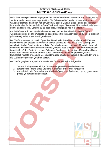Einführung Flächen und Körper Teufelskerl Abul-Wafa (Test) Nach einer alten persischen Sage geriet der Mathematiker und Astronom Abul-Wafa, der im 10. Jahrhundert lebte, einst in große Not. Die Schulden drückten ihn schwer und seine Gläubiger drohten, ihn in den Kerker werfen zu lassen. Da kam eines Nachts der Teufel zu ihm, stellte eine Truhe mit Gold auf den Tisch und sagte: Dieses Gold schenke ich dir, wenn du mir ein Rätsel löst. Schaffst du es aber nicht, so folgst du mir in die Hölle. Abul-Wafa war mit dem Handel einverstanden, und der Teufel stellte seine Aufgabe: Zerschneide drei gleiche Quadrate so, dass du alle Stücke anschliessend zu einem einzigen grösseren Quadrat zusammenfügen kannst. Der Teufel erwartete, dass sein Opfer das Rätsel nicht lösen konnte, aber Abul-Wafa war nicht umsonst der grösste Mathematiker seines Landes. Er fand im Nu eine Lösung, und zerschnitt die drei Quadrate in neun Teile. Dazu halbierte er zuerst zwei Quadrate diagonal und setzte die vier Dreiecke so an das dritte Quadrat, dass die rechte Ecke der Hypotenuse (längste Seite) des Dreiecks zu einer Ecke des Quadrats zu liegen kam. Die rechtwinkligen Ecken der Dreiecke verband er dann durch Linien zu einem neuen grossen Quadrat. Schliesslich musste er noch die vier überstehenden Stücke der Dreiecke abschneiden und in die Lücken des grossen Quadrats setzen. Der Teufel ging leer aus, und Abul-Wafa war für alle Zeit seine Sorgen los. 1. Zeichne drei Quadrate mit 5,1 cm Seitenlänge und schneide diese aus. 2. Berechne die Fläche eines Dreiecks. Achtung: Formel nicht vergessen! 3. Nun sollst du die Geschichte von Abul-Wafa nachempfinden und das so gewonnene grosse Quadrat unten aufkleben.