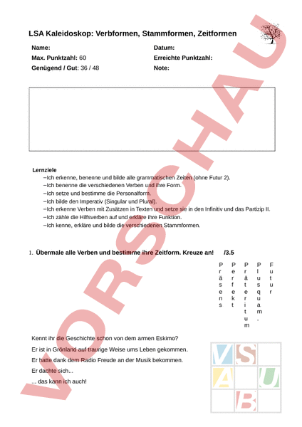 LSA Kaleidoskop: Verbformen, Stammformen, Zeitformen Name: Datum: Max. Punktzahl: 60 Erreichte Punktzahl: Genügend Gut: 36 48 Note: Lernziele Ich erkenne, benenne und bilde alle grammatischen Zeiten (ohne Futur 2). Ich benenne die verschiedenen Verben und ihre Form. Ich setze und bestimme die Personalform. Ich bilde den Imperativ (Singular und Plural). Ich erkenne Verben mit Zusätzen in Texten und setze sie in den Infinitiv und das Partizip II. Ich zähle die Hilfsverben auf und erkläre ihre Funktion. Ich kenne, erkläre und bilde die verschiedenen Stammformen. 1. Übermale alle Verben und bestimme ihre Zeitform. Kreuze an! /3.5 r ä e s Kennt ihr die Geschichte schon von dem armen Eskimo? Er ist in Grönland auf traurige Weise ums Leben gekommen. Er hatte dank dem Radio Freude an der Musik bekommen. Er dachte sich. . das kann ich auch! e f k r ä e i u l s u m u u So ist er ins Unglück gekommen. Was wird ihm wohl geschehen? 2. In welcher Zeit stehen die folgenden Sätze? Benenne die Zeitform und schreibe den Satz in der verlangten Zeit! /6 In Syrien werden viele Menschen Opfer des Krieges. Präsens Das Waffengesetz hat in den USA für heftige Diskussionen gesorgt. Plusquamperfekt Ich muss nur noch kurz die Welt retten. Perfekt 3. Suche und kennzeichne alle Verben (blau übermalen), Vorsilben (blau unterstreichen) und Zusätze (grün unterstreichen) im folgenden Text. /6 Greg steht eine neue Herausforderung bevor. Der Valentinstag rückt näher, und er hat immer noch keine Tanzpartnerin für den Schulball gefunden. Denn Greg macht bei Mädchen einfach alles falsch, was man falsch machen kann. Dass es seinem Freund Rupert genauso geht, ist da nur ein schwacher Trost. Und dass es in seiner Klasse mehr Jungs als Mädchen gibt, entspannt die Lage auch nicht gerade. Keine rosigen Aussichten für Greg! Fällt ihm nicht bald etwas ein, muss er alleine hingehen! Lies die Geschichte selber nach im neusten Band von Gregs Abenteuern. 4. Benenne die Form der verschiedenen Verben in der Tabelle. Fahr! schreiben singen gemeldet geflogen Zeig! arbeiten Friss! Zeichnet! gehandelt 5. Bilde je einen Satz pro Personalform. 1 /6 /5 2 3 4 5 6 6. Benenne die Personalform der folgenden Sätze. (z.B. 3. Person Singular) /4 Personalform Du spinnst doch komplett. Das Radio spielt ein Lied von Avril Lavigne. Unsere Computer laufen auf Hochtouren. Schmerzt deine Hand vom Schreiben schon? Wir müssen noch die Schlange füttern! Ich fahre übermorgen in die Berge. Ihr bringt uns immer wieder zum Lachen! Über den Wolken muss die Freiheit wohl grenzenlos sein. 7. Fülle die fehlenden Angaben in der Tabelle aus. Infinitiv Partizip 2 3. Pers. Sing. Präteritum /12.5 Imperativ Sing. Imperativ Plur. kommen gehabt er stank Renn! Schaut! 8. Kennzeichne alle Verben (blau übermalen), Vorsilben (blau unterstreichen) und Zusätze (grün unterstreichen) im folgenden Text. Notiere dann den Infinitiv und das Partizip 2. /8 Infinitiv Partizip 2 Sie hüpft herum wie ein Zicklein. Der Junge hüpft über die Strasse. Sie sucht dich seit Stunden! Ich versuche es bestimmt. Sie suchen uns auf. Mein Freund reist nicht so gern. Jetzt verreist ihr schon wieder? Er reist morgen aus. 9. Notiere die verschiedenen Hilfsverben und erkläre ihre Funktion. Mache ein Beispiel. /3 Hilfsverb Funktion 10. Welche Stammformen gibt es? Erkläre sie. /3 I. II. III. 11. Notiere zu jeder Stammform ein Beispiel. /3 Infinitiv Präteritum Partizip 2 Stammform