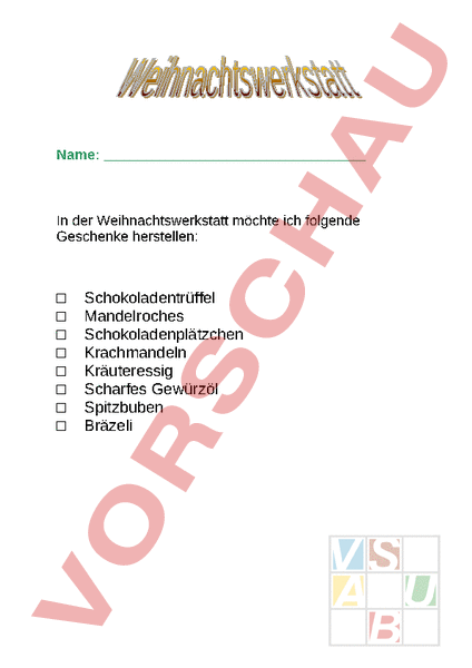 Name: In der Weihnachtswerkstatt möchte ich folgende Geschenke herstellen: Schokoladentrüffel Mandelroches Schokoladenplätzchen Krachmandeln Kräuteressig Scharfes Gewürzöl Spitzbuben Bräzeli