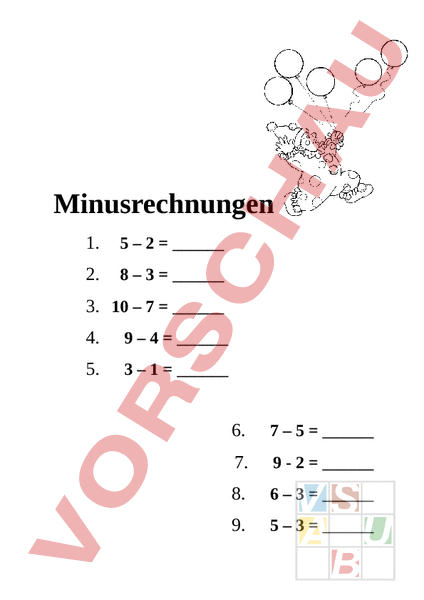 Minusrechnungen 1. 5 – 2 2. 8 – 3 3. 10 – 7 4. 9 – 4 5. 3 – 1 6. 7 – 5 7. 9 2 8. 6 – 3 9. 5 – 3 10. 10 – 5 11. 12 – 2 12. 15 – 5 13. 11 – 1 14. 20 – 10 15. 11 – 10 Diese Aufgaben waren für mich