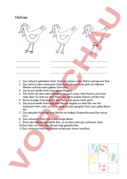 Hühner 1. Das schwarz gefiederte Huhn läuft als Letztes in der Reihe und legt drei Eier. 2. Das nicht zu dem schwarzen Huhn benachbarte Huhn pickt am liebsten Weizen und hat einen gelben Schnabel. 3. Das braunweiße Huhn frisst gerne Roggen. 4. Das Huhn mit dem roten Schnabel hat auch einen roten Kamm und einen roten Bart. Es läuft vor dem Huhn, das einen pinken Kamm und Bart hat. 5. Einen orangen Schnabel hat das Huhn, das gerne Hafer pickt. 6. Das braunweiße Huhn legt jede Woche doppelt so viele Eier wie das schwarze Huhn, aber nur eines mehr als das getupfte Huhn, das gelbe Beine hat. 7. Das getupfte Huhn legt jede Woche ein halbes Dutzend braune Eier minus eins. 8. Das schwarze Huhn hat keine orange Beine. 9. Eines der Hühner legt weiße Eier, es ist aber nicht das schwarze Huhn. 10.Das Huhn mit den roten Beinen legt getupfte Eier. 11.Das schwarze Huhn hat keinen schwarzen Kamm und Bart.