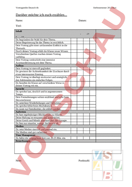 Vortragsreihe Deutsch 4b Herbstsemester 2012 Buri Darüber möchte ich euch erzählen. Name: Datum: Titel: Inhalt -/ Du begründest die Wahl für dein Thema. Deine Begeisterung für das Thema ist ersichtlich. Dein Vortrag gibt einen umfassenden Einblick in die Thematik. Durch deinen Vortrag erhält die Klasse neues Wissen. Verschiedene Quellen machen deinen Vortrag vielfältig. Dein Vortrag verdeutlicht eine intensive Auseinandersetzung mit dem Thema. Aufbau Dein Vortrag ist sinnvoll gegliedert. Du gewinnst die Aufmerksamkeit der Zuschauer durch einen interessanten Einstieg. Dein Vortrag ist überlegt strukturiert und ermöglicht den Zuhörenden ein einfaches Folgen. Du beziehst die Klasse auf verschiedene Weise in deinen Vortrag mit ein. Sprache Du sprichst laut, deutlich und in angemessenem Tempo. Dein Formulierungen wirken erzählend und echt (kein Herunterleiern) Du unterlässt Wiederholungen und Füllwörter. Du sprichst fehlerfreies Hochdeutsch. Du nutzt nur Fremdwörter, die erklärt werden. Auftreten Du hast regelmässigen Blickkontakt zur Klasse. Deine Haltung ist entspannt und konzentriert. Deine Gestik und Mimik unterstreichen das Gesagte. Du liest nur einzelne, wenige Stichworte ab. Medien Du setzt Medien sinnvoll und passend ein. Die Medien sind gut vorbereitet. Time Management Du hältst die vorgegebene Zeit von 20-25 Min. ein. Bemerkungen Note: Punktzahl: