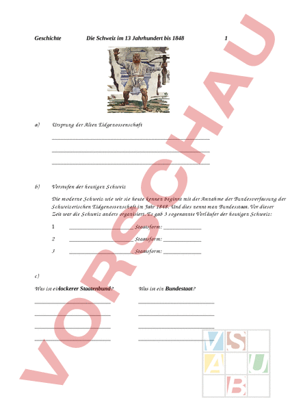 Geschichte a) Die Schweiz im 13 Jahrhundert bis 1848 1 Ursprung der Alten Eidgenossenschaft b) Vorstufen der heutigen Schweiz Die od erne Schweiz wie wir sie heute kennen be ginnt mit der Annah e der Bundesverfassung der Schweizerischen Eidgenossenschaft m Jahr 1848. Und dies nennt man Bundesstaat. Vor dieser Zeit war die Schweiz anders organisiert. Es gab 3 sogenannte Vorläufer der heutigen Schweiz: 1 Staatsfor m: 2 Staatsfor m: 3 Staatsfor m: c) Was ist einlockerer Staatenbund? Was ist ein Bundestaat?