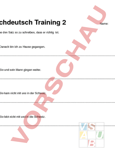Hochdeutsch Training 2 Name: Versuche den Satz so zu schreiben, dass er richtig ist. 1. Danach bin ich zu Hause gegangen. 2. Sie und sein Mann gingen weiter. 3. Sie kam nicht mit uns in der Schweiz. 4. Sie lebt nicht mit und in die Schweiz. 5. In den Ferien ist er in Paris gegangen. 6. Er spielt gerne mit Mäuse. 7. Mein Vater hat die Mäuse müssen raus tun. 8. Er freut sich, wenn ich in Garten komme. 9. In Mazedonien, bei mein Grossvater.