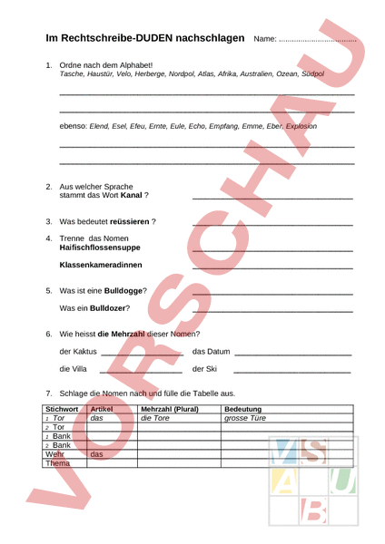 Im Rechtschreibe-DUDEN nachschlagen Name: 1. Ordne nach dem Alphabet! Tasche, Haustür, Velo, Herberge, Nordpol, Atlas, Afrika, Australien, Ozean, Südpol ebenso: Elend, Esel, Efeu, Ernte, Eule, Echo, Empfang, Emme, Eber, Explosion 2. Aus welcher Sprache stammt das Wort Kanal 3. Was bedeutet reüssieren 4. Trenne das Nomen Haifischflossensuppe Klassenkameradinnen 5. Was ist eine Bulldogge? Was ein Bulldozer? 6. Wie heisst die Mehrzahl dieser Nomen? der Kaktus das Datum die Villa der Ski 7. Schlage die Nomen nach und fülle die Tabelle aus. Stichwort Artikel Mehrzahl (Plural) Bedeutung Tor 2 Tor 1 Bank 2 Bank Wehr Thema das die Tore grosse Türe 1 das