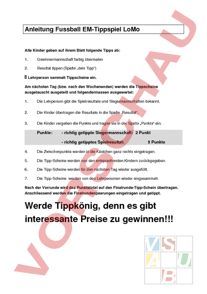 Anleitung Fussball EMTippspiel LoMo Alle Kinder geben auf ihrem Blatt folgende Tipps ab: 1. Gewinnermannschaft farbig übermalen 2. Resultat tippen (Spalte „dein Tipp) Lehrperson sammelt Tippscheine ein. Am nächsten Tag (bzw. nach den Wochenenden) werden die Tippscheine ausgetauscht ausgeteilt und folgendermassen ausgewertet: 1. Die Lehrperson gibt die Spielresultate und Siegermannschaften bekannt. 2. Die Kinder übertragen die Resultate in die Spalte „Resultat. 3. Die Kinder vergeben die Punkte und tragen sie in der Spalte „Punkte ein. Punkte: richtig getippte Siegermannschaft: 2 Punkt richtig getipptes Spielresultat: 5 Punkte 4. Die Zwischenpunkte werden in die Kästchen ganz rechts eingetragen. 5. Die TippScheine werden nun den entsprechenden Kindern zurückgegeben. 6. Die TippScheine werden für den nächsten Tag wieder ausgefüllt. 7. Die TippScheine werden von den Lehrpersonen wieder eingesammelt. Nach der Vorrunde wird das Punktetotal auf den FinalrundeTippSchein übertragen. Anschliessend werden die Finalrundenpaarungen eingetragen und getippt. Werde Tippkönig, denn es gibt interessante Preise zu gewinnen!!!