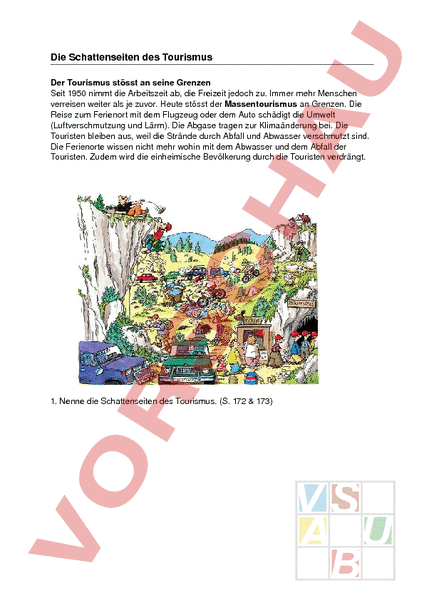 Die Schattenseiten des Tourismus Der Tourismus stösst an seine Grenzen Seit 1950 nimmt die Arbeitszeit ab, die Freizeit jedoch zu. Immer mehr Menschen verreisen weiter als je zuvor. Heute stösst der Massentourismus an Grenzen. Die Reise zum Ferienort mit dem Flugzeug oder dem Auto schädigt die Umwelt (Luftverschmutzung und Lärm). Die Abgase tragen zur Klimaänderung bei. Die Touristen bleiben aus, weil die Strände durch Abfall und Abwasser verschmutzt sind. Die Ferienorte wissen nicht mehr wohin mit dem Abwasser und dem Abfall der Touristen. Zudem wird die einheimische Bevölkerung durch die Touristen verdrängt. 1. Nenne die Schattenseiten des Tourismus. (S. 172 173) 2. Was könnten die Leute in Torremolinos tun, damit weiterhin Touristen kommen? (S. 174) 3. Wasser und Abfallprobleme auf Naxos Schlage Massnahmen vor, welche die Umweltbelastung mindern könnten. Der Erlebniskonsum kennt keine Grenzen 1. Zähle verschiedene Erlebnissportarten auf. 2. Wieso werden diese „besonderen Erlebnisse für die Menschen immer wie wichtiger? Sanfter Tourismus – Ausweg mit Widersprüchen 1. Welche Voraussetzungen müssten deiner Meinung nach gegeben sein, damit an einem Ferienort sanfter Tourismus möglich wird? S. 177)