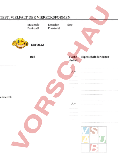 KURZTEST: VIELFALT DER VIERECKSFORMEN Name VIEL Name Maximale Punktzahl Erreichte Punktzahl Note ERFOLG! Bild Fläche ninhalt . A . Parallelenviereck A . Eigenschaft der Seiten Eigenschaft der Winkel . . . . . . . . . . . . . A . Trapez A . . . . . . . . . . . . .