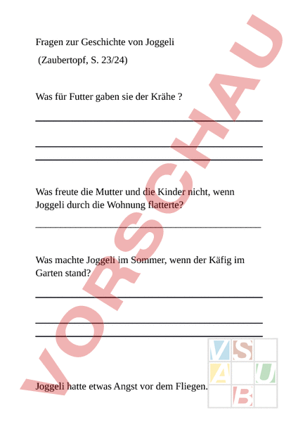 Fragen zur Geschichte von Joggeli (Zaubertopf, S. 23/24) Was für Futter gaben sie der Krähe Was freute die Mutter und die Kinder nicht, wenn Joggeli durch die Wohnung flatterte? Was machte Joggeli im Sommer, wenn der Käfig im Garten stand? Joggeli hatte etwas Angst vor dem Fliegen. Trotzdem gelangen ihm Landungen. Wohin? Was spielte der Vogel frei auf der Wiese? Wie ist es am Schluss dem Joggeli ergangen? Was denkst du