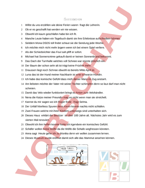 SATZZEICHEN 1 Willst du uns erzählen wie deine Ferien waren fragt die Lehrerin. 2 Ob er es geschafft hat werden wir nie wissen. 3 Obwohl ich kaum geschlafen habe bin ich fit. 4 Manche Leute haben ein Tagebuch damit sie ihre Erlebnisse aufschreiben können. 5 Seitdem Mona DSDS toll findet schaut sie die Sendung jede Woche. 6 Ich möchte mich nicht mehr ärgern wenn ich bei einem Spiel verliere. 7 Als der Schiedsrichter das Foul sah pfiff er sofort. 8 Michael hat Sonnencrème gekauft damit er keinen Sonnenbrand bekommt. 9 Das Dach der Turnhalle welches voll Schnee war stürzte plötzlich ein. 10 Der Baum der schon sehr alt ist trägt keine Früchte mehr. 11 Draussen liegt noch Schnee obwohl es bereits Mitte April ist. 12 Luna das ist der Hund meiner Nachbarin ist eine schwarze Hündin. 13 Ich habe das komische Gefühl dass mich dieser Mann im Zug anstarrt. 14 Am liebsten möchte der Vater mit seiner Tochter schimpfen denn so laut darf man nicht schreien. 15 Damit das Velo wieder funktioniert bringt es Anton zum Velohändler. 16 Nena die Katze meiner Freundin mag es nicht wenn man sie streichelt. 17 Kannst du mir sagen wo ich Roger finde fragt Selma. 18 Der Unfall hiterliess Spuren denn Kevin konnte nachts nicht schlafen. 19 Zwei Frauen welche mit ihren Kindern unterwegs sind unterhalten sich. 20 Dieses Haus erklärt der Besitzer ist über 100 Jahre alt. Nächstes Jahr wird es zum vierten Mal renoviert. 21 Obwohl ich ihm helfen konnte hatte ich irgendwie ein komisches Gefühl. 22 Schäfer wollen keine Wölfe da die Wölfe die Schafe wegfressen könnten. 23 Anna sagt Heute gehe ich zu Monika denn wir wollen zusammen lernen. 24 Dieses Museum wurde eröffnet damit sich alle das Mammut ansehen können.