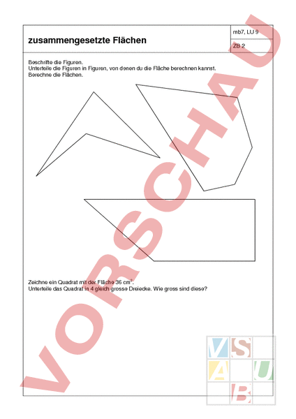 mb7, LU 9 zusammengesetzte Flächen Beschrifte die Figuren. Unterteile die Figuren in Figuren, von denen du die Fläche berechnen kannst. Berechne die Flächen. Zeichne ein Quadrat mit der Fläche 36 cm2. Unterteile das Quadrat in 4 gleich grosse Dreiecke. Wie gross sind diese? ZB 2
