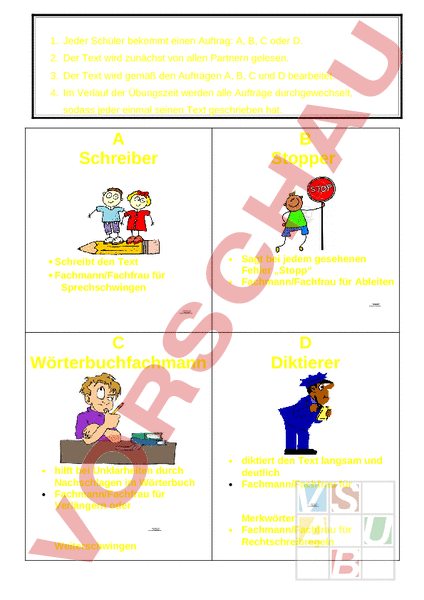 1. Jeder Schüler bekommt einen Auftrag: A, B, oder D. 2. Der Text wird zunächst von allen Partnern gelesen. 3. Der Text wird gemäß den Aufträgen A, B, und bearbeitet. 4. Im Verlauf der Übungszeit werden alle Aufträge durchgewechselt, sodass jeder einmal seinen Text geschrieben hat. Schreiber Stopper • • Schreibt den Text • Fachmann/Fachfrau für Sprechschwingen • Sagt bei jedem gesehenen Fehler „Stopp Fachmann/Fachfrau für Ableiten QuickTimeª and decompressor are needed to see this picture. QuickTimeª and decompressor are needed to see this picture. Wörterbuchfachmann • • hilft bei Unklarheiten durch Nachschlagen im Wörterbuch Fachmann/Fachfrau für Verlängern oder QuickTimeª and decompressor are needed to see this picture. Weiterschwingen Diktierer • • diktiert den Text langsam und deutlich Fachmann/Fachfrau für QuickTimeª and decompressor are needed to see this picture. • Merkwörter Fachmann/Fachfrau für Rechtschreibregeln