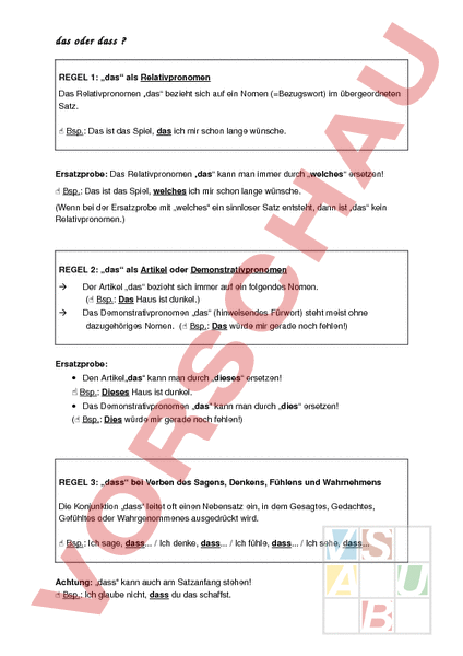 das oder dass REGEL 1: „das als Relativpronomen Das Relativpronomen „das bezieht sich auf ein Nomen (Bezugswort) im übergeordneten Satz. Bsp.: Das ist das Spiel, das ich mir schon lange wünsche. Ersatzprobe: Das Relativpronomen „das kann man immer durch „welches ersetzen! Bsp.: Das ist das Spiel, welches ich mir schon lange wünsche. (Wenn bei der Ersatzprobe mit „welches ein sinnloser Satz entsteht, dann ist „das kein Relativpronomen.) REGEL 2: „das als Artikel oder Demonstrativpronomen Der Artikel „das bezieht sich immer auf ein folgendes Nomen. ( Bsp.: Das Haus ist dunkel.) Das Demonstrativpronomen „das (hinweisendes Fürwort) steht meist ohne dazugehöriges Nomen. ( Bsp.: Das würde mir gerade noch fehlen!) Ersatzprobe: • Den Artikel„das kann man durch „dieses ersetzen! Bsp.: Dieses Haus ist dunkel. • Das Demonstrativpronomen „das kann man durch „dies ersetzen! ( Bsp.: Dies würde mir gerade noch fehlen!) REGEL 3: „dass bei Verben des Sagens, Denkens, Fühlens und Wahrnehmens Die Konjunktion „dass leitet oft einen Nebensatz ein, in dem Gesagtes, Gedachtes, Gefühltes oder Wahrgenommenes ausgedrückt wird. Bsp.: Ich sage, dass. Ich denke, dass. Ich fühle, dass. Ich sehe, dass. Achtung: „dass kann auch am Satzanfang stehen! Bsp.: Ich glaube nicht, dass du das schaffst. Bsp.: Dass du das schaffst, glaube ich nicht.