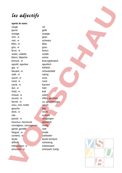 les adjectifs après le nom: rouge jaune orange vert, -e noir, -e bleu, -e gris, -e brun, -e violet, violette blanc, blanche bronzé, -e sportif, sportive gai, -e bavard, -e salé, -e sucré, -e rond, -e carré, -e dur, -e froid, -e chaud, -e ouvert, -e fermé, -e mou, mol, molle gauche droit, -e vite passé, -e heureux, heureuse courageux, courageuse gentil, gentille fatigué, -e content, -e facile difficile intéressant, -e amusant, -e rot gelb orange grün schwarz blau grau braun violett weiss braungebrannt sportlich fröhlich schwatzhaft salzig süss rund karriert hart kalt warm offen, geöffnet zu, geschlossen weich link recht schnell vergangen glücklich mutig nett müde zufrieden leicht /einfach schwierig interessant amüsant, lustig avant le nom: grand, -e petit, -e joli, -e jeune haut, -e court, -e long, longue gros, grosse faux, fausse bon, bonne mauvais, -e autre double demi, -e gross klein hübsch jung hoch kurz lang dick falsch gut schlecht andere doppelt halb beau, bel, belle schön vieux, vieil, vieille alt nouveau, nouvel, nouvelle neu