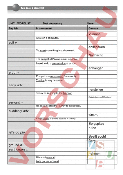 UNIT 1 WORDLIST English Test Vocabulary In the context Name: German Vulkane file on computer. edit anschauen To insert something in document. Nachricht The subject of Paolas email is school. need to do presentation at school. anhängen erupt Pompeii is commercial Roman city. Trading is very important. early adv herstellen Today he is going to the harbour. Sei ein braves Mädchen! servant His servants start the journey to the harbour. suddenly adv zittern high column of smoke appears in the sky. Bergspitze rufen lets go phr Beeilt euch! Berg ground earthquake nehmen We must escape! Lets get out of here! far away adv Hab keine Angst! Take these cushions and cover your heads. atmen dark adj cloud of ash covers the sun. cover covered riechen slope blasen segeln The sea is really rough! try tried überleben Marcia looks back at the terrible scene. traurig afraid adj passieren angry adj The energy inside the Earth comes to the surface. toxic adj töten crash crashed Druck The volcano is dormant at the moment. extinct adj berühmt verliebt sein He asked Tizoc for permission to marry the princess. marry married He sent Popocatépetl to war. sterben wahr
