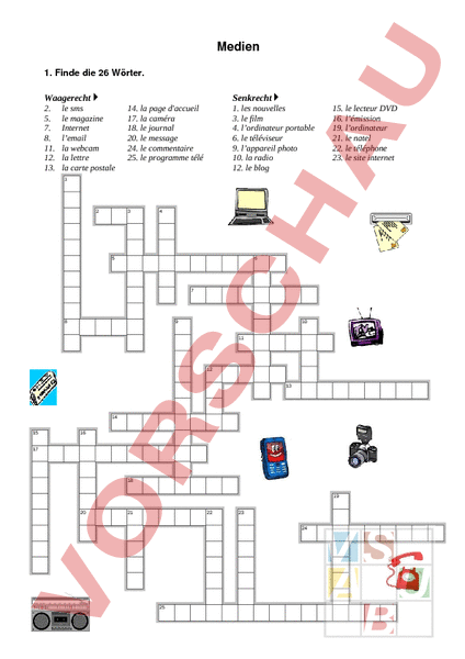 Medien 1. Finde die 26 Wörter. Waagerecht 2. 5. 7. 8. 11. 12. 13. Senkrecht le sms le magazine Internet lemail la webcam la lettre la carte postale 14. la page daccueil 17. la caméra 18. le journal 20. le message 24. le commentaire 25. le programme télé 1. les nouvelles 3. le film 4. lordinateur portable 6. le téléviseur 9. lappareil photo 10. la radio 12. le blog 15. le lecteur DVD 16. lémission 19. lordinateur 21. le natel 22. le téléphone 23. le site internet 1 2 3 4 5 6 7 8 9 10 11 12 13 14 15 16 17 18 19 20 21 22 23 24 25 EclipseCrossword.com 2. Was passt zusammen? Manchmal gibt es mehrere Antworten. arbeiten – surfen – hören – ansehen – aufnehmen – schicken – schreiben – lesen – spielen – anrufen – chatten – herunterladen – anmachen 1. im Internet 2. eine SMS eine EMail 3. ein Buch 4. einen Film 5. Musik 6. Nachrichten im Fernsehen 7. einen Kommentar 8. am Computer 9. den Fernseher Computer 10. eine Zeitschrift 11. Videos 12. einen Freund 3. Beschreibe zwei Medien: wie sieht es aus, was macht man damit, gab es es früher, ist es teuer, benützt du es oft? 1: 2: