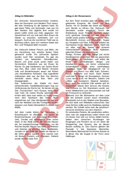 Alltag im Mittelalter Alltag in der Renaissance Ein römischer Geschichtsschreiber erwähnt, dass die Germanen vom blanken Tisch assen, der eine Vertiefung für die Speisen hatte. Es gab keine Teller und Schüsseln, man ass mit den Händen. Der tägliche Brei wurde mit einem Löffel, meist aus Holz, gegessen. Die Gewohnheit sich vor und nach dem Essen die Hände zu waschen, verbreitete sich nur langsam. Auch an der vornehmen Tafel war es durchaus üblich, dass sich mehrere Gäste das Ess- und Trinkgerät teilen mussten. Auf dem Tisch erschien jetzt ein bisher nicht gekanntes Essgerät: die Gabel, mit dem Zweck, mit ihr anstelle der Hand das Essen zum Munde zu führen. Der Gebrauch von Servietten wurde eingeführt. Durch die Entdeckung neuer Erdteile tauchten bisher nicht gekannte Gewürze auf wie Anis und Vanille sowie andere Nahrungsmittel wie Mais, Blumenkohl, Ananas und Rhabarber. Suppe zur Vorspeise und Obst, Käse und Gebäck als Nachspeise wurde allgemein üblich. Nach wie vor aber war die Speise der ärmeren Volksschichten trockenes Brot, Haferbrei, gekochte Erbsen und dazu Wasser. Könige, Fürsten, Bischöfe, Adlige und reiche Handelsherren versuchten sich bei glanzvollen Festlichkeiten zu überbieten, und selbst die Feste der wohlhabenden Bürger und Handwerker waren von bisher unbekannter Aufwendigkeit. Nach einer reichhaltigen Vorspeise folgte ein Hauptgericht mit 12 Gängen mit Fleisch von Wild, Kalb, Schwein, Fasan, Rebhuhn und Huhn. Dann kamen nochmals 9 Gänge mit Süssspeisen. Grosser Luxus wurde auch mit Messern, Gabeln und Löffeln aus kostbarem Material betrieben. Doch auch das einfache Volk wandte sich im steigendem Masse dem Genuss des Essens und Trinkens zu. Der Branntwein wurde von einem Medikament zum Genussmittel und half die Trinksucht zu verbreiten. Während sich die Wohnweise auf dem Land und bei ärmeren Leuten kaum veränderte, entwickelte sich in den Städten eine Bauweise, die sich stark vom Mittelalter unterschied. Das neue Denken sollte auch im Städtebau spürbar werden. Als Vorbild nahm man die griechischrömische Architektur aus dem Altertum. Es entstanden Paläste, die ausdrücken sollten, dass man ein angenehmes Leben führte und mit denen man sich zur Schau stellen konnte. Neben dem römischen Rundbogen bei Eingängen und Fenstern ist es vor allem die Waagrechte, das Gesims, das an diesen Bauten auffällig ist. Das Gesims gliedert die Fassade in klar begrenzte Abschnitte. Besonderes Merkmal der kirchlichen Bauten ist in dieser Zeit die Kuppel in der Form einer Halbkugel. Die Viehzucht lieferte Fleisch und Milch, die zur Herstellung von vielerlei Sorten Käse gebraucht wurde. Für zahlreiche Speisen wurden auch Eier verwendet. Es gab die meisten uns bekannten Getreidesorten. Bauern und arme Leute assen Hafer- und Gerstenbrot, Weissbrot war ein Essen für Reiche. Es gab mindestens vier Sorten Wurst aus Hirn, Blut, Leber und Fleisch. Ärmeres Volk und Klosterinsassen assen viel Rüben und verschiedene Kohlarten. Das eigentliche Volksessen aber war der Brei. Die üblichen Getränke waren Most; Bier, Wein und Honiggetränke. Das Aufkommen der Städte mit ihren weitreichenden Handelsbeziehungen trug zur Verfeinerung der Küche bei. So kamen mit der Zeit „Tischzuchten nach Europa, etwa, dass man nicht mit vollem Munde sprechen oder trinken darf, dass man weder zu hastig essen noch dem Nachbarn das beste Stück wegnehmen soll. Das Händewaschen vor und nach der Mahlzeit und das Tischgebet wurden langsam zum festen Bestandteil im Ablauf des Mahls. Auf dem Lande lebten die Menschen in Einzelhäusern im Blockbau. Oft waren es Einzimmerhäuser und vereinigten Menschen, Vieh, Vorräte und Arbeitsplatz unter einem Dach. In der Stadt waren die meisten Häuser ein- bis zweigeschossige Holzbauten, nur die Reichen bauten Häuser aus Stein. Da Wohnen und Arbeiten im gleichen Haus stattfanden, mussten in der Enge der Städte die Häuser in die Höhe gebaut werden. Licht machte man mit Kerzen, Fackeln und Öllampen. Geheizt wurde mit Holz oder Torf.