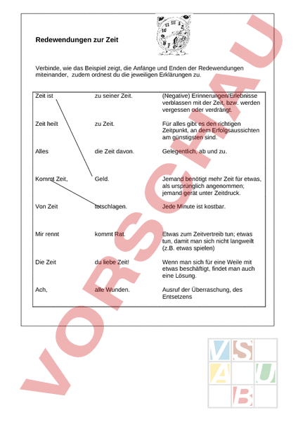 Redewendungen zur Zeit Verbinde, wie das Beispiel zeigt, die Anfänge und Enden der Redewendungen miteinander, zudem ordnest du die jeweiligen Erklärungen zu. Zeit ist zu seiner Zeit. (Negative) Erinnerungen/Erlebnisse verblassen mit der Zeit, bzw. werden vergessen oder verdrängt. Zeit heilt zu Zeit. Für alles gibt es den richtigen Zeitpunkt, an dem Erfolgsaussichten am günstigsten sind. Alles die Zeit davon. Gelegentlich, ab und zu. Kommt Zeit, Geld. Jemand benötigt mehr Zeit für etwas, als ursprünglich angenommen; jemand gerät unter Zeitdruck. Von Zeit totschlagen. Jede Minute ist kostbar. Mir rennt kommt Rat. Etwas zum Zeitvertreib tun; etwas tun, damit man sich nicht langweilt (z.B. etwas spielen) Die Zeit du liebe Zeit! Wenn man sich für eine Weile mit etwas beschäftigt, findet man auch eine Lösung. Ach, alle Wunden. Ausruf der Überraschung, des Entsetzens