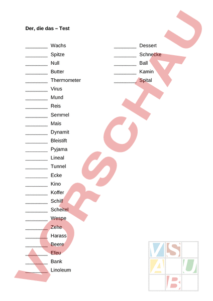 Der, die das – Test Wachs Dessert Spitze Schnecke Null Ball Butter Kamin Thermometer Spital Virus Mund Reis Semmel Mais Dynamit Bleistift Pyjama Lineal Tunnel Ecke Kino Koffer Schilf Scheitel Wespe Zehe Harass Beere Efeu Bank Linoleum