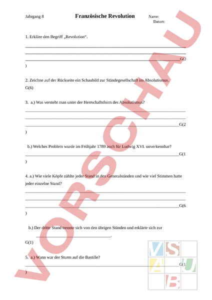 Jahrgang 8 Französische Revolution Name: Datum: 1. Erkläre den Begriff „Revolution. G(2 2. Zeichne auf der Rückseite ein Schaubild zur Ständegesellschaft im Absolutismus. G(6) 3. a.) Was versteht man unter der Herrschaftsform des Absolutismus? G(2 b.) Welches Problem wurde im Frühjahr 1789 auch für Ludwig XVI. unverkennbar? G(1 4. a.) Wie viele Köpfe zählte jeder Stand in den Generalständen und wie viel Stimmen hatte jeder einzelne Stand? G(6 b.) Der dritte Stand trennte sich von den übrigen Ständen und erklärte sich zur. G(1) 5. a.) Wann war der Sturm auf die Bastille? G(1 Jahrgang 8 Französische Revolution Name: Datum: b.) Warum stürmte man gerade die Bastille? G(2