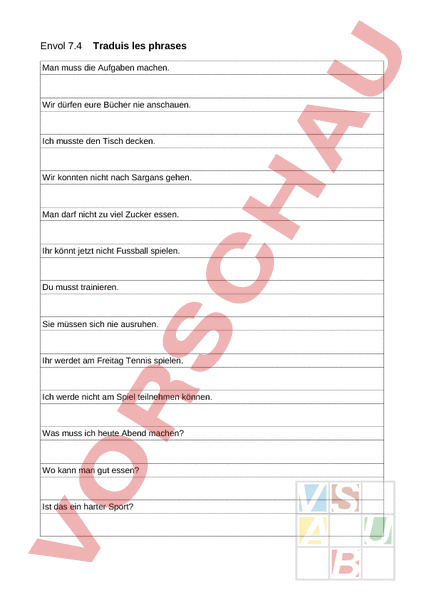 Envol 7.4 Traduis les phrases Man muss die Aufgaben machen. Wir dürfen eure Bücher nie anschauen. Ich musste den Tisch decken. Wir konnten nicht nach Sargans gehen. Man darf nicht zu viel Zucker essen. Ihr könnt jetzt nicht Fussball spielen. Du musst trainieren. Sie müssen sich nie ausruhen. Ihr werdet am Freitag Tennis spielen. Ich werde nicht am Spiel teilnehmen können. Was muss ich heute Abend machen? Wo kann man gut essen? Ist das ein harter Sport?
