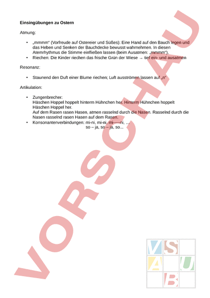 Einsingübungen zu Ostern Atmung: • • „mmmm (Vorfreude auf Ostereier und Süßes): Eine Hand auf den Bauch legen und das Heben und Senken der Bauchdecke bewusst wahrnehmen. In diesen Atemrhythmus die Stimme einfließen lassen (beim Ausatmen: „mmmm). Riechen: Die Kinder riechen das frische Grün der Wiese tief ein- und ausatmen Resonanz: • Staunend den Duft einer Blume riechen; Luft ausströmen lassen auf „n Artikulation: • • Zungenbrecher: Häschen Hoppel hoppelt hinterm Hühnchen her. Hinterm Hühnchen hoppelt Häschen Hoppel her. Auf dem Rasen rasen Hasen, atmen rasselnd durch die Nasen. Rasselnd durch die Nasen rasselnd rasen Hasen auf dem Rasen. Konsonantenverbindungen: mi-ni, mi-ni, mi-----ni, so – ja, so – ja, so.