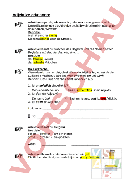 Adjektive erkennen: Adjektive sagen dir, wie etwas ist, oder wie etwas gemacht wird. Deine Eltern kennen die Adjektive deshalb wahrscheinlich noch unter dem Namen „Wiewort. Beispiele: Mein Freund ist traurig. Sie rennt schnell über die Strasse. Adjektive kannst du zwischen den Begleiter und das Nomen setzen. Begleiter sind: der, die, das, ein, eine, . Beispiele: der traurige Freund das schnelle Mädchen Die Lurkprobe: Wenn du nicht sicher bist, ob ein Wort ein Adjektiv ist, kannst du die Lurkprobe machen. Setze das Wort zwischen der und Lurk. Beispiel: Das Haus dort oben sieht unheimlich aus. 1. Ist unheimlich ein Adjektiv? Der unheimliche Lurk 2. Ist dort ein Adjektiv? Der dorte Lurk 3. Ist oben ein Adjektiv? Passt, unheimlich ist ein Adjektiv. Sagt nichts aus, dort ist kein Adjektiv. Lurkprobe: Adjektive kannst du steigern. Beispiele: schön schöner am schönsten gross grösser am grössten weich Adjektive übermalen oder unterstreichen wir gelb. Die Farben sind übrigens auch Adjektive (rot, grün, blau,).