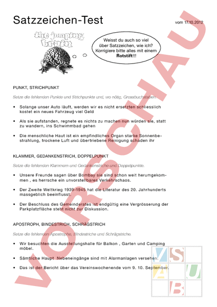 Satzzeichen-Test Weisst du auch so viel über Satzzeichen, wie ich? Korrigiere bitte alles mit einem Rotstift!!! PUNKT, STRICHPUNKT Setze die fehlenden Punkte und Strichpunkte und, wo nötig, Grossbuchstaben. • Solange unser Auto läuf t, werden wir es nicht ersetzten schliesslich kostet ein neues Fahrzeug viel Geld • Als sie aufstanden, regnete es nichts zu machen nun würden sie, statt zu wandern, ins Schwimmbad gehen • Die menschliche Haut ist ein empfindliches Organ starke Sonnenbestrahlung, trockene Luf und über triebene Reinigung schaden ihr KLAMMER, GEDANKENSTRICH, Doppelpunkt Setze die fehlenden Klammern und Gedankenstriche und Doppelpunkte. • Unsere Freunde sagen über Bombay sie sind schon weit herumgekommen es herrsche ein unvorstellbares Verkehrschaos. • Der Zweite Weltkrieg 1939-1945 hat die Literatur des 20. Jahrhunder ts massgeblich beeinflusst. • Der Beschluss des Gemeinderates ist endgültig eine Vergrösserung der Parkplatzfläche steht nicht zur Diskussion. Apostroph, Bindestrich, Schrägstrich Setze die fehlenden Apostrophe, Bindestriche und Schrägstriche. • Wir besuchten die Ausstellungshalle für Balkon Gar ten und Camping möbel. • Sämtliche Haupt Nebeneingänge sind mit Alarmanlagen versehen. • Das ist der Bericht über das Vereinswochenende vom 9. 10. September. vom 17.10.2012 Schreibe den unten stehenden Text ab. Setze dabei alle noch fehlenden Satzzeichen. In die Türkei, schlage ich vor Ana meint Nach Amsterdam Da kannst du ja gleich nach Chicago fahren, sage ich In Amsterdam wimmelt es nur so von Kriminellen Wer sagt das, fragt Ana Ich zucke mit den Achseln Das weiss doch jeder Ausserdem hat Sercan mir neulich erzählt, dass dor Sercan, natürlich, fällt mir Ana ins Wor und zieht eine Augenbraue hoch Mann, Kelebek, echt. Was, frage ich Schon gut Dann sind wir da Sein Name ist übrigens Yusuf Islam, sagt Ana in das Klingeln der Schulglocke hinein. Wessen Name, frage ich ver wirr Cat Stevens, sagt Ana, mehr nicht Aus: Jana Frey, Ich, die Andere. Loewe Verlag GmbH, Bindlach, 2007.