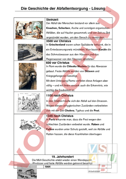Die Geschichte der Abfallentsorgung Lösung Steinzeit Der Abfall der Menschen bestand vor allem aus Knochen, Scherben, Asche und sonstigen organischen Abfällen, die auf Haufen gesammelt, und von Zeit zu Zeit angezündet wurden, um den Geruch zu vermindern. 3500 vor Christus In Griechenland waren schon Spülaborte bekannt, die in ein Entwässerungsnetz mündeten. Man baute Kanäle die das Schmutzwasser aus den Häusern und das Regenwasser von den Strassen ableiteten. 600 vor Christus In Rom wurde die Chloaka Maxima für das Abwasser gebaut. Feste Abfälle wurden von Sklaven und Kriegsgefangenen beseitigt. Mit dem Untergang Roms verfielen diese Anlagen aber völlig – und mit ihnen versank auch die Erkenntnis, wie wichtig die Sauberkeit ist. 1100 nach Christus In den Städten häufte sich der Abfall auf den Strassen. Wegen diesen unhygienischen Zuständen verbreiteten sich mit der Zeit Cholera, Typhus und die Pest. 1348 nach Christus In Paris erkannte man, dass die Pest wegen den schlechten Zuständen verbreitet wurde. Raben und Falken wurden unter Schutz gestellt, weil sie Abfälle und Ratten frassen, die diese Krankheiten übertrugen 19. Jahrhundert Die MüllGeschichte erlebt wieder einen Wendepunkt. Abwässer und feste Abfälle werden getrennt beseitigt. 1904 Arbeitsblatt Die erste Kehrichtsverbrennungsanlage (KVA) der Schweiz wird in Zürich gebaut. 1913 In Bern wurde der Abfall erstmals von Sträflingen nach Glas, Metall, Leder und Papier getrennt. 1920 Der Abfalleimer von Jakob Ochsner verbreitet sich in der ganzen Schweiz. Die vollen Eimer wurden von Pferdewagen ca. alle 2 Wochen von Stadtarbeitern eingesammelt und weggebracht. 1930 Die ersten motorisierten Güselwagen verkehren in der Zentralschweiz. 1950 – 1960 Der Müll wird auf Deponien gelagert, was die Gewässer sehr stark verschmutzt. Ausserdem wird der Platz für solche Deponien immer knapper. So wird das Ablagern von Industriemüll auf solchen Deponien bald verboten. 1970 Der Abfallsack wird erfunden und verdrängt den bewährten Ochsner Abfallkübel. 1980 1981 Der Zuger Kantonsrat fällt den Entscheid, dass Hausmüll nicht mehr deponiert werden darf, sondern ab sofort in die KVA‘s zur Entsorgung transportiert werden muss. Arbeitsblatt