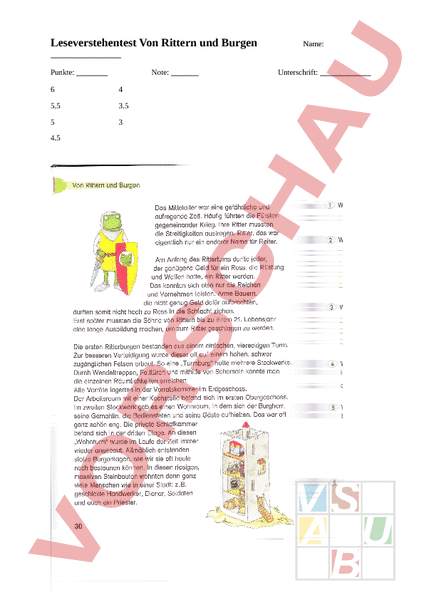 Leseverstehentest Von Rittern und Burgen Name: Punkte: Note: 6 4 5.5 3.5 5 3 4.5 Unterschrift: 1.) Das Wort Ritter bedeutet: (/1) 2.) Was befand sich wo? Beschrifte was sich in den jeweiligen Etagen befindet. (/4) 3. Obergeschoss: 2. Obergeschoss: 1. Obergeschoss: Erdgeschoss: 3.) Was brauchte man um am Anfang der Ritterzeit Ritter zu werden? Nenne 4 Sachen. (/2) 4.) Wie kam ein Ritter an sein Pferd? (/1) Er bekam es geschenkt. Er musste es selber kaufen. Er bekam es ausgeliehen. Er musste es selber fangen. 5.) Wo wurden Turmburgen meistens gebaut? (/1) Irgendwo wo es flach war, dass sie mit dem Pferd hoch konnten. auf einem hohen Felsen. In einem See. 6.) Wie entstand aus dem Wohnturm später eine Burg? (/1) 7.) Was für Menschen wohnten schlussendlich in den Burganlagen ausser den Rittern? (/2)