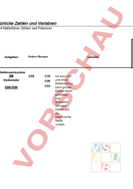 C Natürliche Zahlen und Variablen C1 – C4 Natürlichen Zahlen und Potenzen Dossier Aufgaben AA Weitere Übungen Lernziel / Buch C1 Das Stellenwertsystem AB Stellentafel C26 C19 Stellentafel C20 C33 S. 53 AB 2 C24, C25 Ich kann mit und ohne Stellenwertsy stem grosse Zahlen lesen, schreiben und darstellen. Ich kann Zahlen auf die gewünschte Stelle runden. ange messe ü k n a t Lernziel für Note 4 Pflicht? Korrektur . . S. 57 S. 58 C51 C52 C61 C62 C55 C57 C64 C53 C54 C67 Ich kann 12 Beispiele von Zahlenstrahle aus dem Alltag nennen. Ich kann mich auf dem Zahlenstrahl orientieren. C63 C65 . Ich kann ein Koordinatensystem zeichnen, Punkte lesen und eintragen. . C66 C2 Rechnen mit natürlichen Zahlen C113 Theorie C115 C111 S. 66 C112 C114 C116 C119 Ich kenne die Begriffe Summand, Summe, Minuend, Subtrahend und Differenz, Addition und Subtraktion und kann sie mit Beispielen erklären und anwenden. . AB 2 AB 2 S. 76 S. 81 C150 Theorie S. 71 S. 66 C148 C149 Theorie S. 7677 Theorie S. 8182 C4 Potenzen C196 C197 C199 C202 C243 C245 C198 C200 C203 Ich kann die Klammerrege der Addition und Subtraktion richtig anwenden und kenne die zwei Gesetze der Rechenvortei le. Ich kenne die Begriffe Faktor, Produkt, Dividend, Divisor und Quotient. Ich kann sie mit Beispiele erklären und anwenden. Ich kann mit der „Punkt vorStrich Regel rechnen und kann vermischte Aufgaben der Grundoperati onen lösen. . . . S. 93 S. 9394 Theorie S. 93 C342 C343 C344 C339 C341 C347 C350 C340 C345 C346 Ich kann die Begriffe Basis, Exponent und Potenz erklären. Ich kann wiederholten Multiplikation en als Potenzen darstellen und umgekehrt. Ich kann Potenzen berechnen. . . C348 C351 S. 95 S. 96 Theorie S. 95 C363 C364 C365 C359 C360 C366 C357 Ich kann die „Potenzvor Strich Regel anwenden und Potenzaufga ben in den vier Grundoperati onen lösen. Ich kann mit Zehnerpoten zen rechnen. . . C367, C369, C370, C372, C374 .