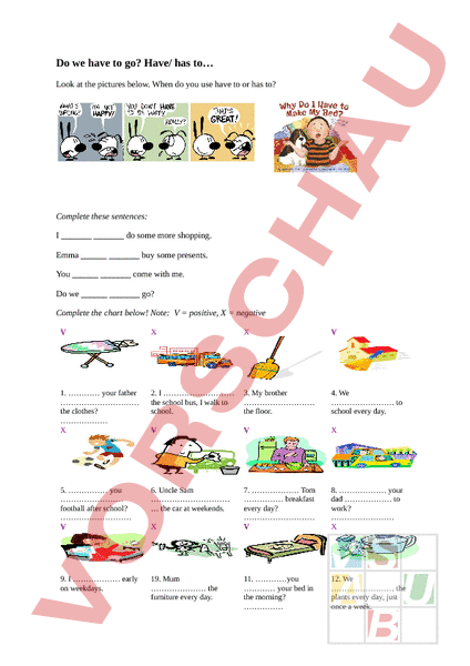 Do we have to go? Have/ has to Look at the pictures below. When do you use have to or has to? Complete these sentences: do some more shopping. Emma buy some presents. You come with me. Do we go? Complete the chart below! Note: positive, negative 1. your father the clothes? 2. the school bus, walk to school. 3. My brother the floor. 4. We to school every day. 5. you football after school? 6. Uncle Sam the car at weekends. 7. Tom breakfast every day? 8. your dad to work? 9. early on weekdays. 19. Mum the furniture every day. 11. you your bed in the morning? 12. We the plants every day, just once week.