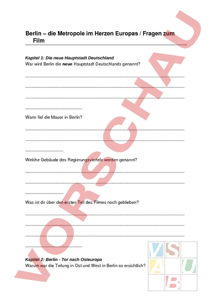 Berlin – die Metropole im Herzen Europas Fragen zum Film Kapitel 1: Die neue Hauptstadt Deutschland War wird Berlin die neue Hauptstadt Deutschlands genannt? Wann fiel die Mauer in Berlin? Welche Gebäude des Regierungsviertels werden genannt? Was ist dir über den ersten Teil des Filmes noch geblieben? Kapitel 2: Berlin Tor nach Osteuropa Warum war die Teilung in Ost und West in Berlin so ersichtlich? Wozu gab es den „Checkpoint Charly? Wer durfte diesen passieren? Wofür ist der gebliebene Mauerstreifen heute noch Mahnmal? Woran erinnert uns das zweite im Film gezeigte Mahnmal? Teil 3: Berlin eine internationale Kunstmetropole Wie viele Museen gibt es etwa in Berlin? Welche bekannte Museen werden genannt? Welche Art Museum würde dich interessieren? Teil 4: Berlin – Wundertüte für Entdeckungsreisende Welche Sehenswürdigkeiten werden genannt? Welche Information über diese Sehenswürdigkeiten könntest du dir merken? Teil 5: Berühmte Bauwerke und Plätze Welche Bauwerke und Plätze werden gezeigt? Welche Sehenswürdigkeiten in Berlin würdest du dir dann gerne anschauen? Was interessiert dich ansonsten in Berlin und vielleicht allenfalls warum?