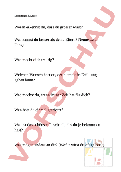 Lebensfragen 6. Klasse Woran erkennst du, dass du grösser wirst? Was kannst du besser als deine Eltern? Nenne zwei Dinge! Was macht dich traurig? Welchen Wunsch hast du, der niemals in Erfüllung gehen kann? Was machst du, wenn keiner Zeit hat für dich? Wen hast du einmal getröstet? Was ist das schönste Geschenk, das du je bekommen hast? Was mögen andere an dir? (Wofür wirst du oft gelobt?) Zähle drei Dinge auf, die man nicht mit Geld kaufen kann. Versuch, dich zu erinnern: Welcher deiner Wünsche ist in deinem Leben schon in Erfüllung gegangen? Was würdest du deinen Kindern erlauben, was deine Eltern dir nicht erlauben? Was glaubst du: Wenn man bei Dunkelheit in den Himmel schaut, was befindet sich hinter den Sternen? Ab wann ist man gross? Wovor hattest du früher Angst, jetzt aber nicht mehr? Wen hast du schon einmal getröstet? Wie hast du das gemacht? Hast du einen Schutzengel? Wenn ja, wobei hat er dir schon geholfen? Was ist das Erste, was du machen würdest, wenn du gross bist? Schreibe zwei Dinge auf, die du an dir magst! Was bedeutet Freundschaft? Was möchtest du in der Welt verändern? Warum leben wir? Was ist die Zeit? Wohin gehen wir, wenn wir sterben? Welche Aufgaben hast du in deinem Leben? Was ist ein Gedanke? Warum gibt es Krieg? Wie muss ein Mensch sein, dem du voll und ganz vertraust? Du kannst für einen Tag unsichtbar sein. Was würdest du tun? Was macht einen Menschen aus? Bist zu zufrieden mit deinem Namen? Wenn ja, warum? Wenn nein, wie würdest du gerne heissen? Was macht dich unverwechselbar?