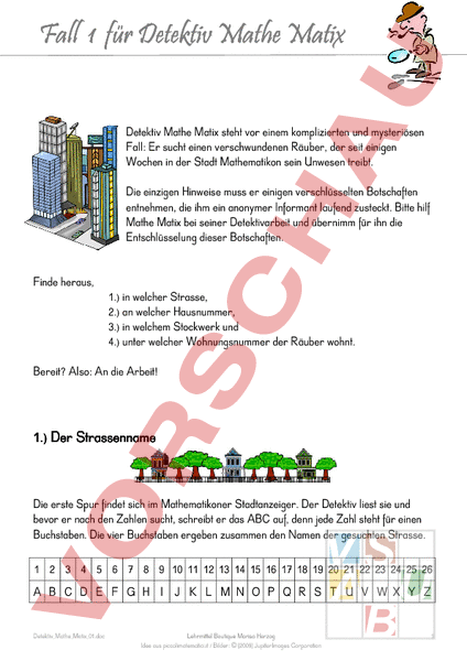 Fall 1 für Detektiv Mathe Matix Matix Detektiv Mathe Matix steht vor einem komplizierten und mysteriösen Fall: Er sucht einen verschwundenen Räuber, der seit einigen Wochen in der Stadt Mathematikon sein Unwesen treibt. Die einzigen Hinweise muss er einigen verschlüsselten Botschaften entnehmen, die ihm ein anonymer Informant laufend zusteckt. Bitte hilf Mathe Matix bei seiner Detektivarbeit und übernimm für ihn die Entschlüsselung dieser Botschaften. Finde heraus, 1.) in welcher Strasse, 2.) an welcher Hausnummer, 3.) in welchem Stockwerk und 4.) unter welcher Wohnungsnummer der Räuber wohnt. Bereit? Also: An die Arbeit! 1.) Der Der Strassen Strassenname Die erste Spur findet sich im Mathematikoner Stadtanzeiger. Der Detektiv liest sie und bevor er nach den Zahlen sucht, schreibt er das ABC auf, denn jede Zahl steht für einen Buchstaben. Die vier Buchstaben ergeben zusammen den Namen der gesuchten Strasse. 1 2 3 4 5 6 7 8 9 10 11 12 13 14 15 16 17 18 19 20 21 22 23 24 25 26 B D F H J L N P R T V WX Z Detektiv_Mathe_Matix_01.doc Lehrmittel Boutique Marisa Herzog Idee aus piccolimatematici.it Bilder: [2009] JupiterImages Corporation 1 Fall 1 für Detektiv Mathe Matix Matix Die Zahl zum ersten ersten Buchstaben lautet: Nimm alle zweistelligen Zahlen, von denen eine Ziffer die 3 ist davon alle ungeraden Zahlen davon alle Zahlen, die nicht durch sieben teilbar sind davon alle Zahlen, deren einstellige Quersumme* nicht 3 ist davon alle Zahlen, die verdoppelt kleiner sind als 100 davon die Zahl, deren Einerziffer um eins grösser ist als die Zehnerziffer davon die Zehnerziffer. einstellige Quersumme bedeutet: Von der Quersumme wird weiter so lange die Quersumme gebildet, bis nur noch eine einstellige Zahl übrig bleibt. Detektiv_Mathe_Matix_01.doc Lehrmittel Boutique Marisa Herzog Idee aus piccolimatematici.it Bilder: [2009] JupiterImages Corporation 2 Fall 1 für Detektiv Mathe Matix Matix Die Zahl zum zweiten zweiten Buchstaben lautet: Nimm alle durch drei teilbaren Zahlen zwischen 0 und 72 davon alle ungeraden Zahlen davon alle Zahlen, die nicht durch sieben teilbar sind davon alle Zahlen, die nicht durch fünf teilbar sind davon alle Zahlen, deren einstellige Quersumme* kleiner ist als vier davon alle Zahlen, deren Zehnerzahl nicht gleich ist wie ihre einstellige Quersumme* davon die kleinere Zahl minus zwei. einstellige Quersumme bedeutet: Von der Quersumme wird weiter so lange die Quersumme gebildet, bis nur noch eine einstellige Zahl übrig bleibt. Detektiv_Mathe_Matix_01.doc Lehrmittel Boutique Marisa Herzog Idee aus piccolimatematici.it Bilder: [2009] JupiterImages Corporation 3 Fall 1 für Detektiv Mathe Matix Matix Die Zahl zum dritten dritten Buchstaben lautet: Nimm alle durch zwei teilbaren Zahlen zwischen 7 und 55 davon alle Zahlen, die weder durch drei noch durch fünf teilbar sind davon alle Zahlen, die nicht durch sieben teilbar sind davon alle Zahlen, die die Ziffer 3 enthalten davon alle Zahlen, die nicht die Hälfte von 76 sind davon die kleinere Zahl minus elf. Detektiv_Mathe_Matix_01.doc Lehrmittel Boutique Marisa Herzog Idee aus piccolimatematici.it Bilder: [2009] JupiterImages Corporation 4 Fall 1 für Detektiv Mathe Matix Matix Die Zahl zum vierten vierten Buchstaben lautet: Nimm alle Zahlen der Siebnerreihe zwischen 2 und 72 davon alle geraden Zahlen davon alle Zahlen, die nicht durch drei teilbar sind davon alle Zahlen, die nicht durch fünf teilbar sind davon alle Zahlen, deren einstellige Quersumme* kleiner ist als vier Zähle die Einerziffer der kleineren Zahl zu der Zehnerziffer der grösseren. Die Strasse heisst STRASSE einstellige Quersumme bedeutet: Von der Quersumme wird weiter so lange die Quersumme gebildet, bis nur noch eine einstellige Zahl übrig bleibt. Detektiv_Mathe_Matix_01.doc Lehrmittel Boutique Marisa Herzog Idee aus piccolimatematici.it Bilder: [2009] JupiterImages Corporation 5 Fall 1 für Detektiv Mathe Matix Matix 2.) Die Die Hausnummer Die nächsten Informationen kommen über den Computer in Form eines Sudokus zu Detektiv Mathe Matix. Wäre schön, wenn du ihm wieder helfen könntest. Schreibe in jedes leere Feld des Sudokus eine Zahl von 1 bis 6. In einer Zeile, in einer Spalte und in einem fett umrandeten Feld darf jede Zahl nur einmal vorkommen. Die beiden Ziffern im gelb markierten Feld ergeben die zweistellige Hausnummer des Räubers. 5 2 3 3 2 3 6 6 2 5 6 4 5 3 Die Hausnummer ist die Detektiv_Mathe_Matix_01.doc Lehrmittel Boutique Marisa Herzog Idee aus piccolimatematici.it Bilder: [2009] JupiterImages Corporation 6 Fall 1 für Detektiv Mathe Matix Matix 3. Das Stockwerk Der Detektiv kennt jetzt zwar die Strasse und die Hausnummer, doch wie soll er jetzt weiter suchen? Da rattert das Faxgerät – neue Hinweise des Informanten sind im Anmarsch Denke dir eine Zahl! Nimm sie mal 2! Zähle 10 dazu! Teile das Ergebnis durch 2! Zähle 7 dazu! Ziehe die gedachte Zahl ab! Zähle die beiden Ziffern zusammen! Das Ergebnis ist Der gesuchte Einbrecher wohnt im Stockwerk des Hauses. 4. Die Wohnungsnummer Die letzte Hilfe hört Mathe Matix zufällig im Radio. Sofort dreht er die Lautstärke auf und bekommt die folgende Aufgabe: Denke dir eine Zahl zwischen 1 und 100! Nimm sie mal 3! Zähle 45 dazu! Verdopple das Ergebnis! Teile es durch 6! Ziehe die gedachte Zahl ab! Das Ergebnis ist Der gesuchte Einbrecher wohnt in der Wohnung mit der Nummer Detektiv_Mathe_Matix_01.doc Lehrmittel Boutique Marisa Herzog Idee aus piccolimatematici.it Bilder: [2009] JupiterImages Corporation 7 Fall 1 für Detektiv Mathe Matix Matix Jetzt kannst du mit deinen Informationen den Einbrecher leicht identifizieren. Harry Hürzel Baumstrasse 61 3. Stock Wohnung 14 Joe Müller Baumstrasse 59 2. Stock Wohnung 15 Jacky Frei Bautstrasse 60 3. Stock Wohnung 27 Herr Wüst Baumstrasse 61 3. Stock Wohnung 15 Kalle Kater Baumstrasse 61 1. Stock Wohnung 12 Herr Schwarz Baumstrasse 61 3. Stock Wohnung 25 Du hast Detektiv Mathe Matix sehr geholfen. Er geht jetzt zur Polizei und